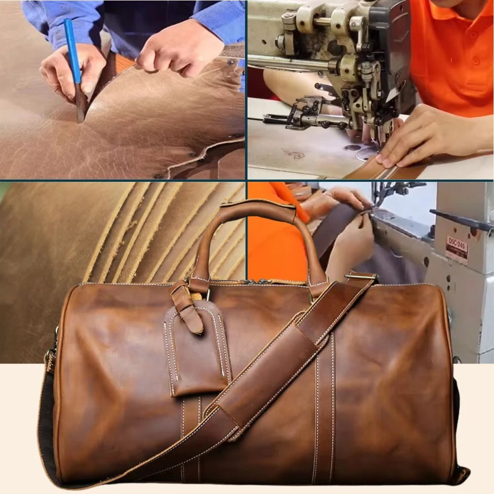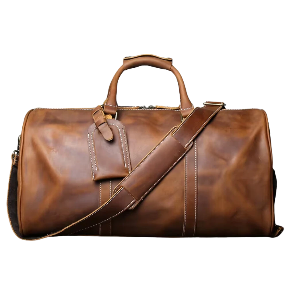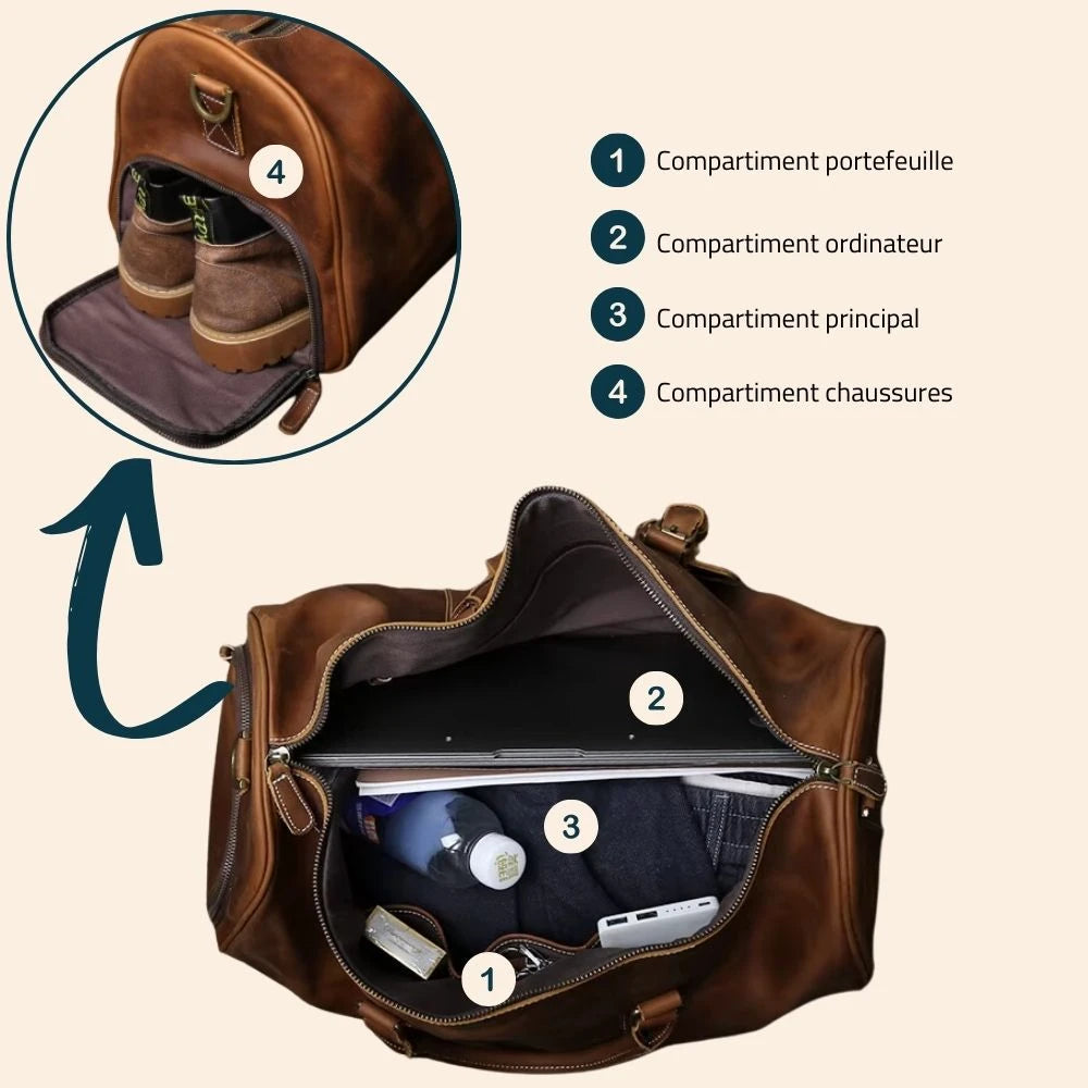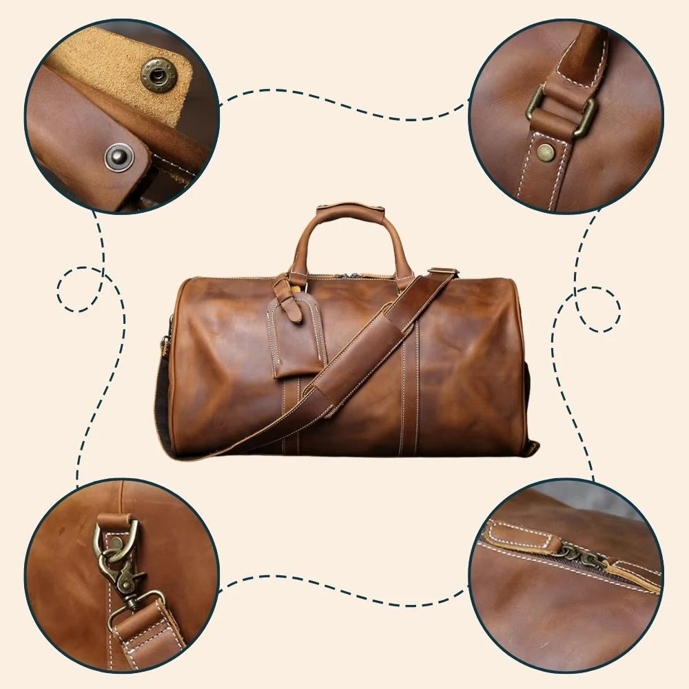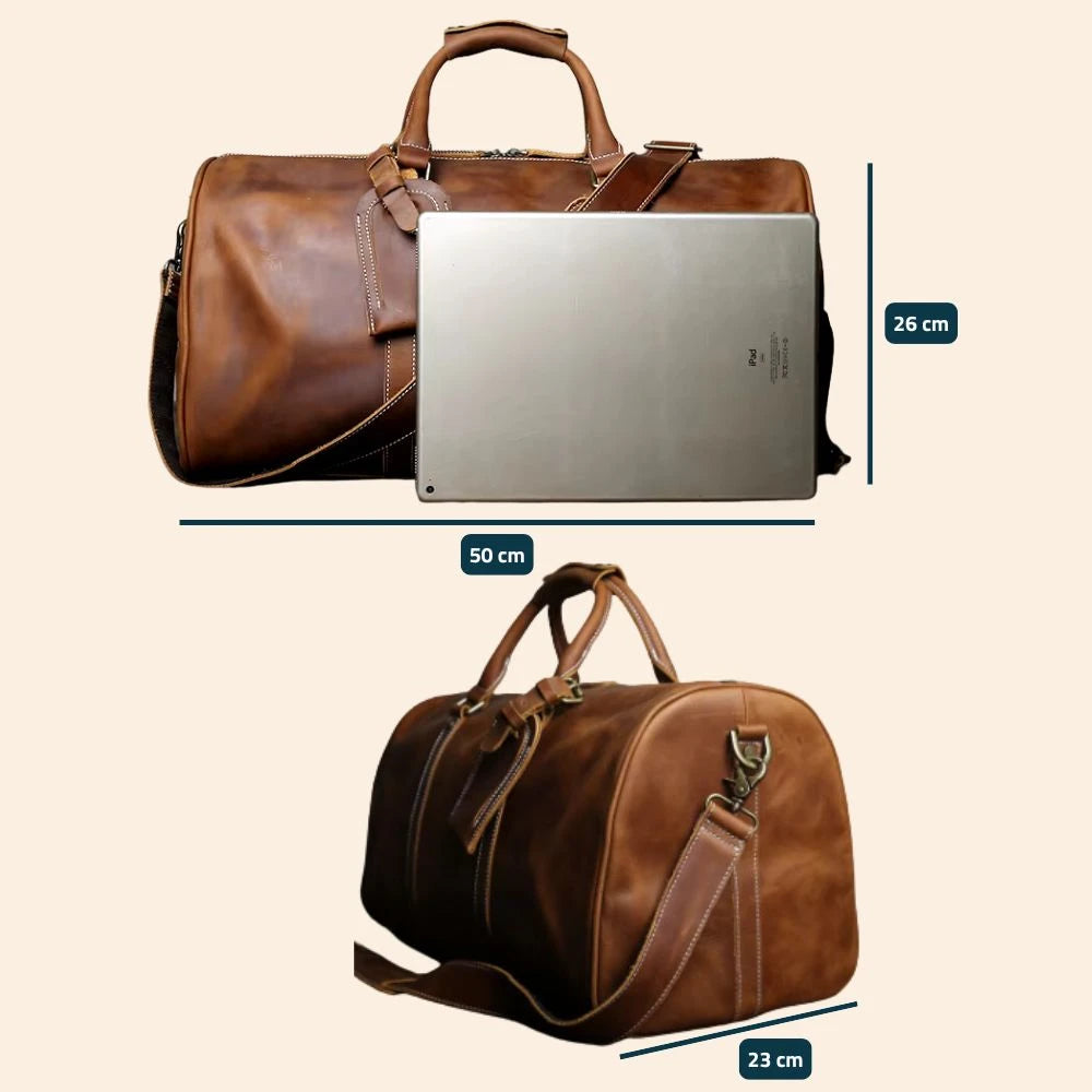 Reisen Sie mit Stil und Selbstvertrauen mit dieser strapazierfähigen Ledertasche, die Stil und Funktionalität vereint.