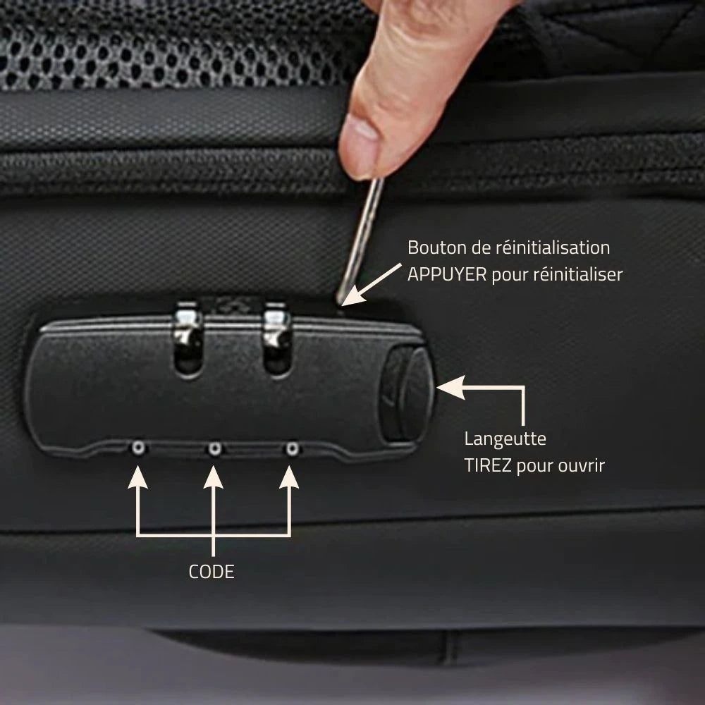 - Étape 1 : Débloquez la serrure en entrant le code par défaut 0-0-0 et libérez la tête de la fermeture éclair.