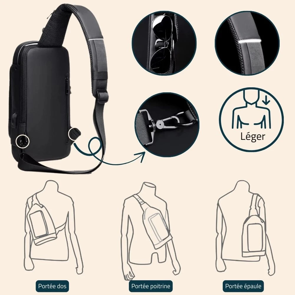 Gardez vos affaires en sécurité tout en gardant les mains libres ! Ce sac à bandoulière pour homme est conçu pour vous protéger des pickpockets grâce à ses compartiments zippés dissimulés, son port USB intégré et sa sangle réglable, tout en gardant vos objets de valeur hors de vue.