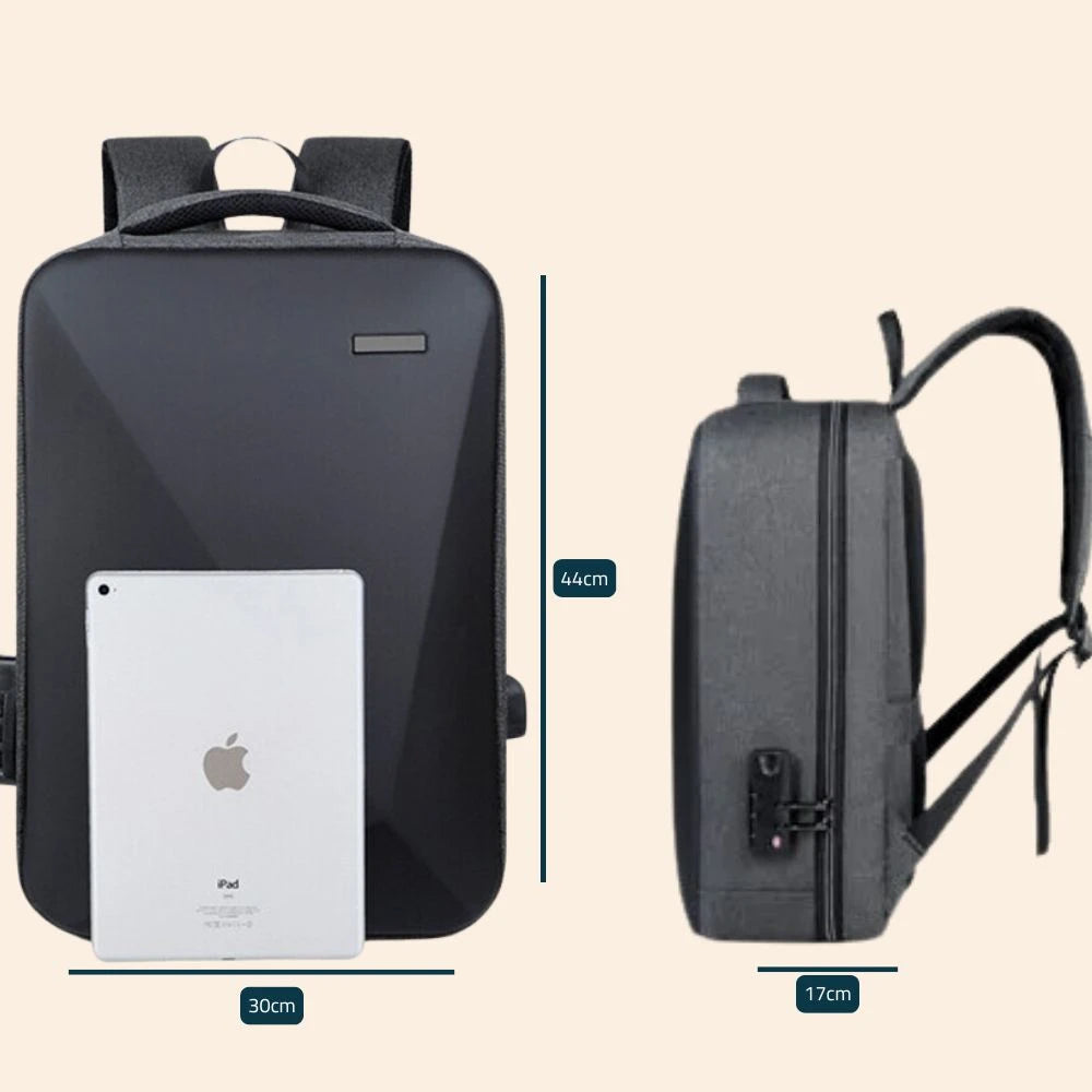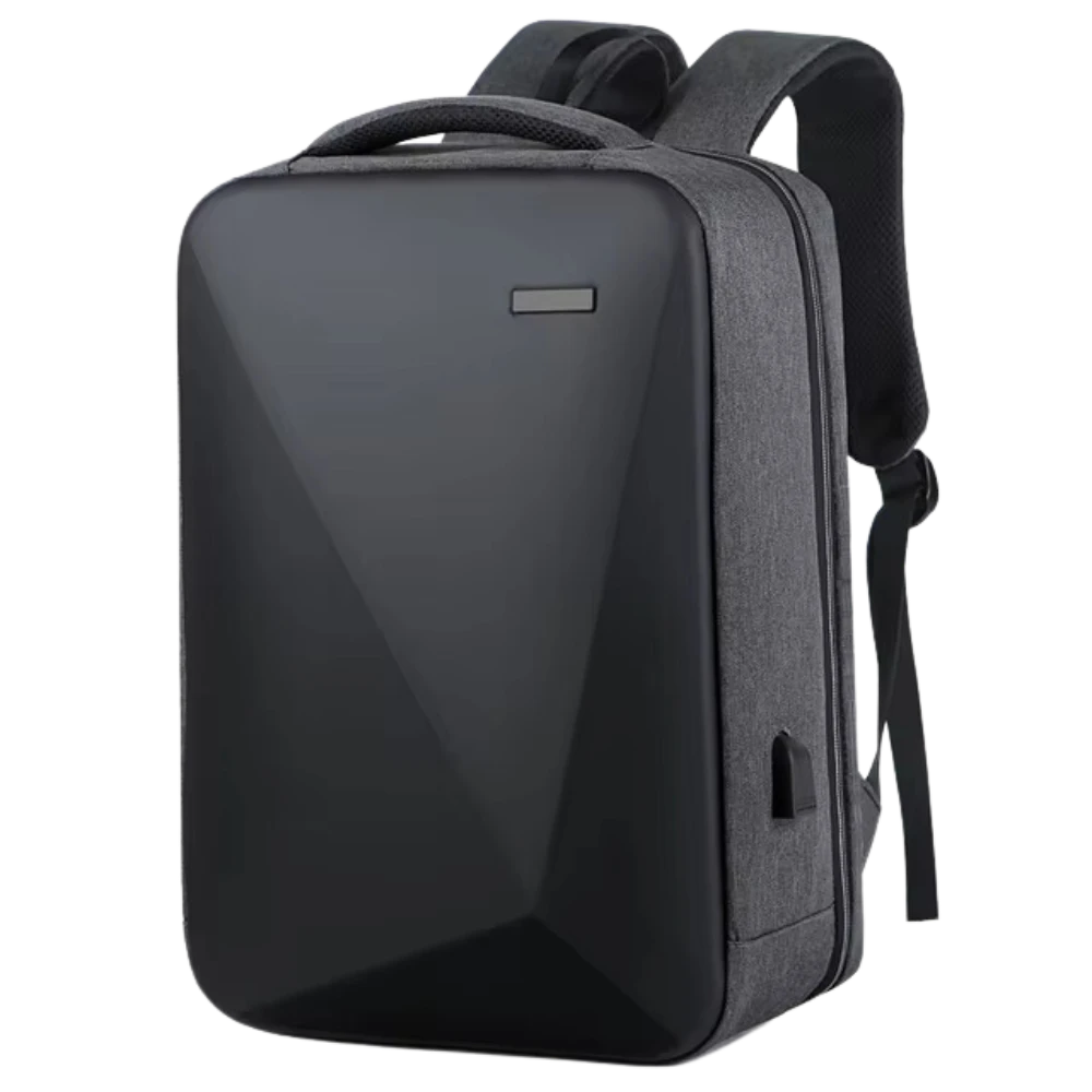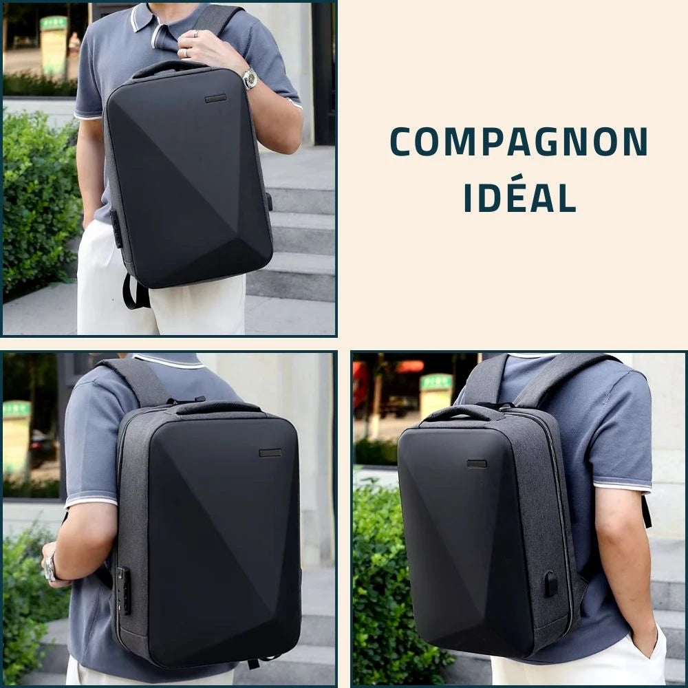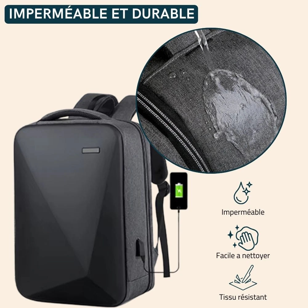 Sac à dos imperméable avec coque rigide géométrique, doté de compartiments multiples pour ordinateur portable, accessoires, et documents. Équipé d'une sortie USB externe, bretelles rembourrées, et tissu respirant. Un compagnon élégant et fonctionnel, parfait pour vos déplacements professionnels ou urbains.