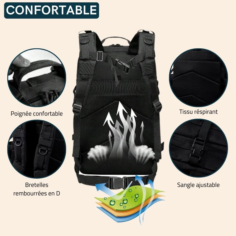 Le Sac à Dos Tactique allie ergonomie et confort grâce à ses bretelles rembourrées, sa poignée douce, et son tissu respirant. Son design ajustable et son système de ventilation offrent une expérience agréable, même lors d'une utilisation prolongée.