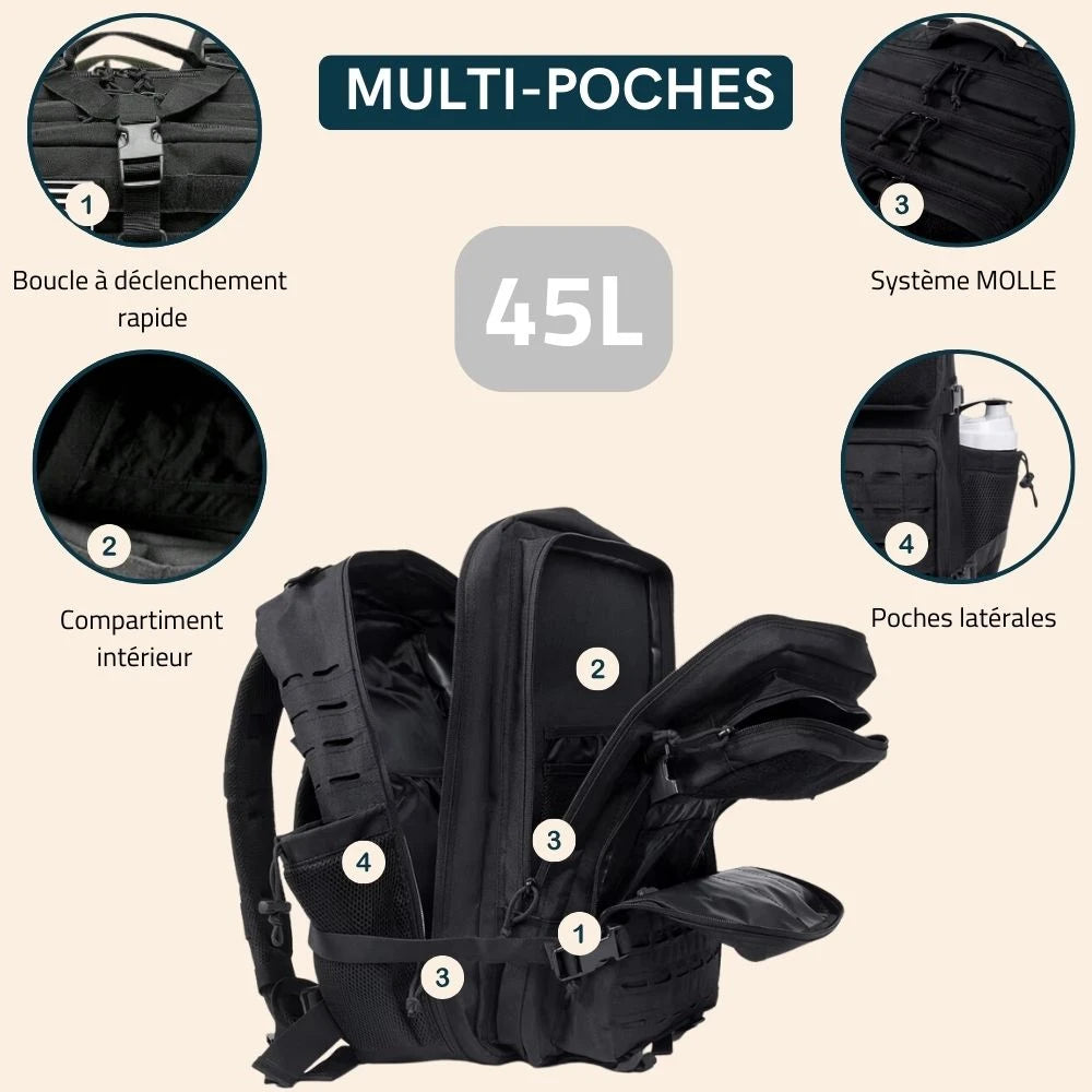 Absolument, le sac est équipé du système MOLLE, vous permettant d’ajouter des poches ou accessoires supplémentaires.