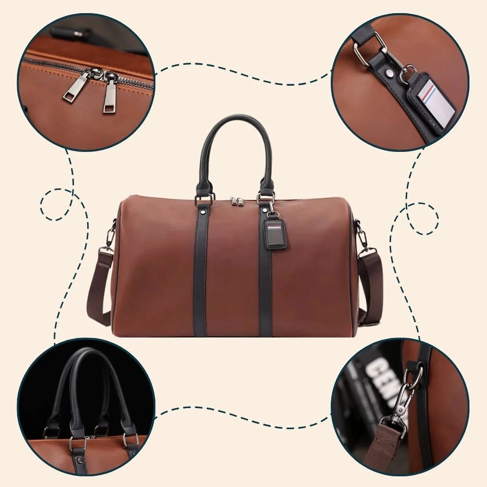 Ce sac allie des fermetures éclair robustes, des boucles métalliques élégantes et des poignées renforcées. Chaque détail est soigneusement conçu pour garantir durabilité, style intemporel et praticité, idéal pour vos déplacements.